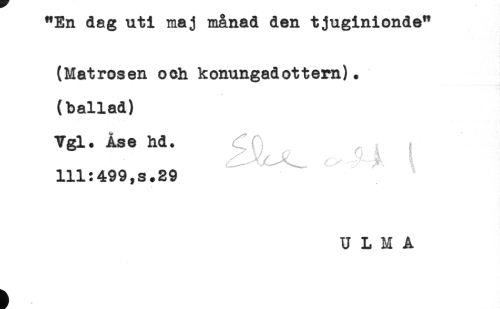 //// "En dag uti maj månad den tjuginionde" //// (Matrosen och konungadottern). //// (ballad) //// Vgl. Åse hd. „ , //// 111:499,s.29 //// U L M A ////
