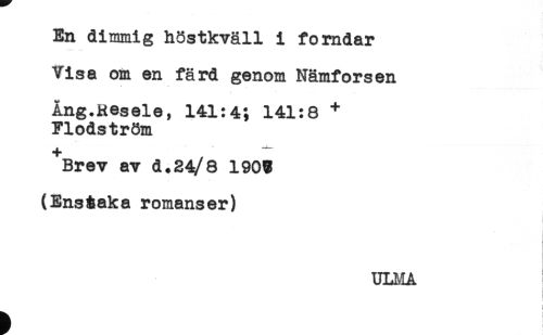 //// En dimmig höstkväll i fomdar //// Visa om en färd genom Nämforsen //// Ång.Resele, 141:4; 141:6 + //// Flodström //// + , ^ //// Brev av d.24/8 1909 //// (Enstaka romanser) //// ULMA ////