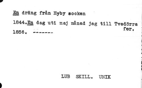 //// En dräng från Hyby socken //// 1844.En dag uti maj månad jag till Tvedörra //// 1856. ---- //// ) //// [ //// i //// r //// f //// H //// L //// t //// ] //// E //// t //// LUB SKILL. UNIK , ////