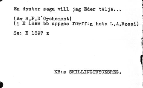 //// En dyster saga vill jag Eder tälja... //// (Av S.P.D^Orchemont) //// (i E 1898 bb uppges f8rff:n heta L.A.Rossi) //// *- //// Se: E 1897 z //// < //// ! //// KB:s SKILLINGTRYCKSREG. ^ //// - { //// ! //// : ////