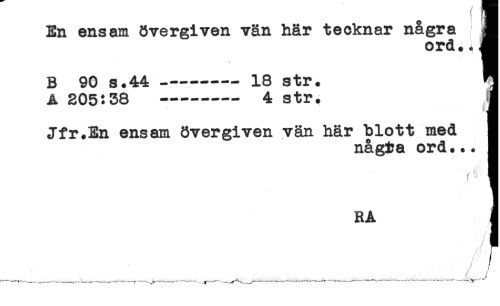 //// En ensam övergiven vän här tecknar några H //// ord.< ^ //// B 90 s.44-----18 str. H //// A 205:38 ----- 4 str. H //// n //// Jfr.En ensam övergiven vän här blott med H //// någ^a ord * * * H //// RA a //// ^ j //// f--wr,^-----' ////
