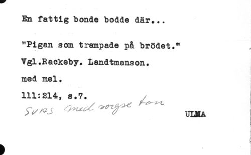 //// En fattig bonde bodde där... //// "Pigan som trampade på brödet." //// Vgl.Rackeby. Landtmanson. //// med mel. //// 111:214, s.7. //// ) //// j //// ! //// < //// ) //// ^ < ////