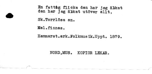 //// En fattig flicka den har jag äKkat //// den har jag älkat utöver allt, //// Sk.Torrlösa sn. //// Kel.finnes. //// Hammarst.ark.Folkmusik.Uppt. 1879. //// NORD.MUS. KOPIOR LEKAR. ////