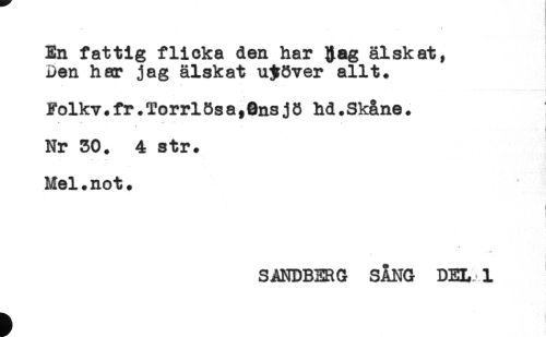 //// En fattig flicka den har &ag älskat, //// Den har jag älskat utöver allt. //// Folkv.fr.Torrlös a $ Bns j ö hd.Skåne + //// c ' ) //// Nr 30. 4 str. //// Mel.not. //// < //// t //// SANDBERG SÅNG DEL 1 ////