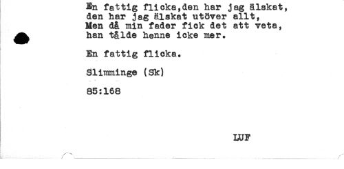 //// an fattig flicka,den har jag alskat, //// den har jag älskat utöver allt, //// Men då min fader fick det att veta, //// ^^ han tålde henne icke mer. //// En fattig flicka. //// H . - .. //// - //// Slimminge (Sk) //// . //// 85:168 //// <i //// t //// ! //// LUF //// ) //// i //// , '_____ ___ ////