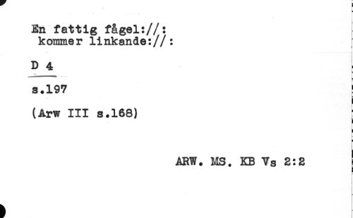 //// ^ H //// En fattig fågel://: //// kommer linkande://: //// . * ! //// ! //// D 4 //// - - - ]. //// s.197 ! //// (Arw III s.168) //// I //// < //// ARW. MS. KB Vs 2:2 ! ////