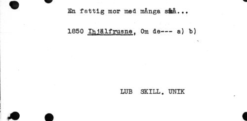 //// En fattig mor med många s&å... //// * . ... //// 1850 Ihlälfrusne. Om de--- a) b) //// LUB SKILL. UNIK ////