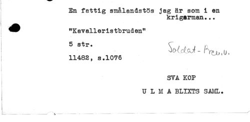 //// En fattig smålandstös jag är som i en //// krigarman... //// "Kavalleristbruden" //// i . //// 11482, s.1076 //// SVA KOP //// * //// U L M A BLIXTS SAML. //// - //// - - - .. - - - ----- - - - - ----- ////