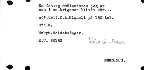 //// ^ En fattig Smålandstös jag är //// som i en krigsman blivit kär... //// not.uppt.K.A.Rignell på 180-tal. //// Sthlm. //// Mskpt.Soldats ånger. //// E.U. 29183 //// < //// NOM .MUS. ////