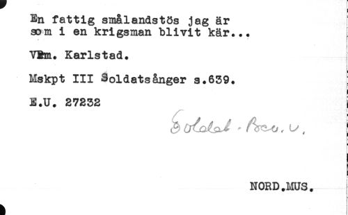 //// En fattig smålandstös jag är ; //// som i en krigsman blivit kär... ! //// * ' ! //// t //// ) //// VRm. Karlstad. //// t //// t //// i //// t //// Mskpt III Soldatsånger s.639. ; //// ) //// E.U. 27232 i //// < //// NORD.MUS. ////