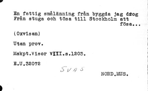 //// * //// En fattig smålänning från byggda jag dRog ! //// Från stuga och tösa till Stockholm att //// fösa... //// i //// (Oxvisan) //// Utan prov. i //// Mskpt.Visor VIII.s.1303. //// E.U.32072 //// <3 M 4? ^ //// NORD.MUS. //// h //// F ////