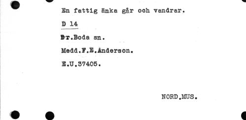 //// En fattig änka går och vandrar. //// D 14 //// < --* -- //// ^r.Boda sn. //// * //// Medd.F.E.Anderson. //// E.U.37405. //// NORD.MUS. ////