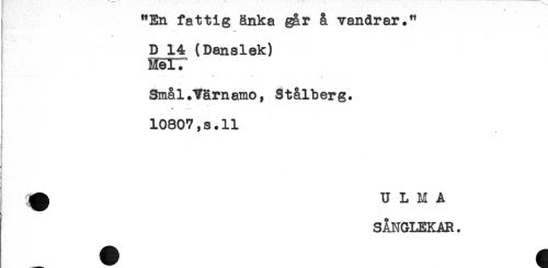 //// A //// "En fattig änka går å vandrar." //// D 14 (Danslek) //// MeTT //// t //// ! ... . //// I Smal .Värnamo, Stålberg. //// 10807,3.11 //// a //// ^ U L M A //// SÅNGLEKAR. ////