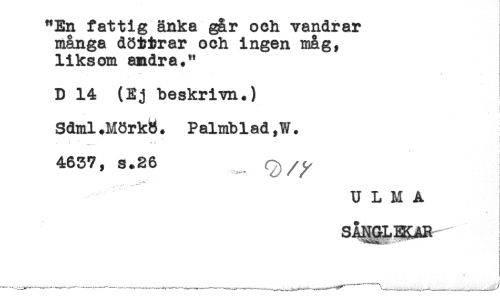 //// "En fattig änka ^r och vandrar //// många de&brar och ingen måg, //// liksom andra." //// ... //// . //// i //// t //// D 14 (Ej beskriva.) //// Sdml.Mörkö. Palmblad,W. //// 4637, s.26 Q/^ //// U L M A //// SÅ^LHSAR ////