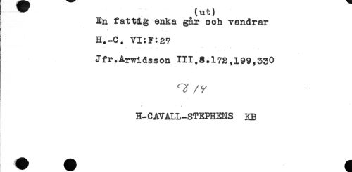 //// ^ (ut) //// En fattig enka går och vandrar //// H.-C. VI:F:27 //// * - ; * -" - * *"* * t //// Jfr.Arwidsson III.S.172,199,330 //// t //// . //// t //// ! //// c ^ //// H-CAVALL-STEPHENS KB //// } ////