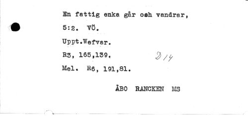 //// En fattig enka går oeh vandrar, //// * //// # 5:2. Vö. //// * , * . . //// Uppt.Wefvar. //// - * ' . . //// R3, 165,139. //// Mel. R6, 191,81. //// ÅBO RANCKEN MS ////
