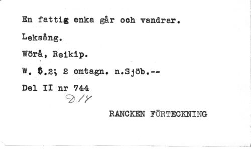 //// . .. i //// i //// En fattig enka går och vandrar. //// Leksång. //// * //// Wörå, Reikip. //// W. $.2; 2 omtagn, n.Sjöb.- //// Del II nr 744 //// RANCKEN FÖRTECKNING ////