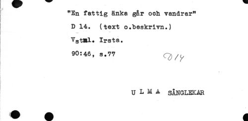 //// "En fattig änka går och vandrar" //// ! D 14. (text o.beskrivn.) //// t //// Vgtml. Irsta. //// 90:46, 3.77 //// * //// ! //// U L M A SÅNGLEKAR ////