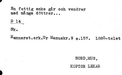 //// En fattig enka går och vandrar //// med många döttrar... //// Sk. //// Hammarst.ark.Ur Manuskr.9 s-157. 1880-talet //// NORD.MUS. //// KOPIOR LEKAR ////