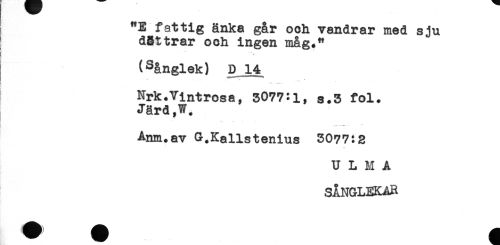 //// "E fattig änka går och vandrar med sju //// dBttrar och ingen måg." //// (Sånglek) D 14 //// ^ . . j * //// K ** -*"- //// Nrk.Vintrosa, 3077:1, s.3 fol. //// Järd,W. //// .- //// Anm.av Kallstenius 3077:2 //// U L M A //// SÅNGLEKAR ////