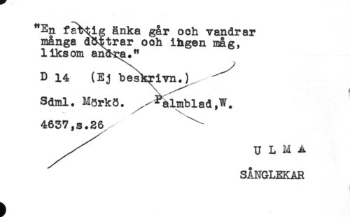 //// En fa^ig änka går och vandrar //// många döttrar och ihgen mag, //// liksom an^ya." //// D 14 (Ej beskrivn.) //// Sdml. Mgrkö. ^^almblad,W. //// 4637,s.26 "" //// U L M A //// SÅNGLEKAR ////