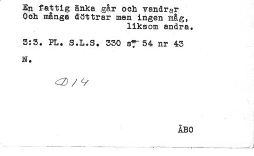 //// En fattig änka går och vandrar //// Och många döttrar men ingen måg, //// liksom andra. //// 3:3. PL. S.L.S. 330 sY*54 nr 43 //// N. //// ÅBO ////