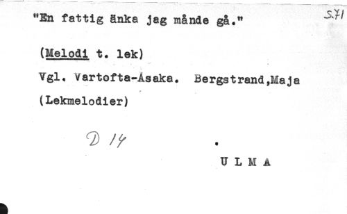 //// "En fattig änka jag månde gå." //// (Melodi t. lek) //// . " * //// Vgl. vartofta-Asaka. Bergstrand,Maja //// (Lekmelodier) //// U L M A ////