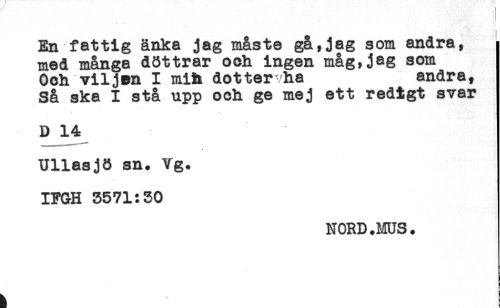 //// En fattig änka jag måste gå,jag som andra, //// med många döttrar och ingen måg,jag som //// Och viljan I mih dotter ha andra, //// Så ska I stå upp och ge mej ett redigt svar //// D 14 //// Ullasjö sn. Vg. //// IFGH 3571:30 //// NORD.MUS. ////