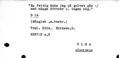 //// "En fattig änka jag på golvet går : //// /med många döttrar o. ingen måg." //// - //// D 14 //// (Sånglek ,m.beskr.) //// t... -t //// * //// Vrml. Köla, Erikson,G. //// * t //// 3357:5 s.3 //// ^ U L M A //// SÅNGLEKAR ////