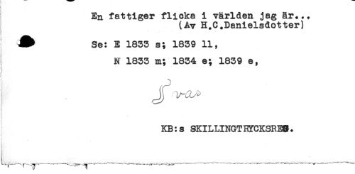 //// En fattiger flicka i världen jag är... //// (Av H.C.Danielsdotter) //// ^ Se: E 1853 s; 1839 11, //// HT 1833 m; 1834 e; 1839 e, //// < //// t //// KB:s SKILLINGT HYCKSREB. ////