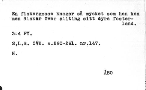 //// En fiskargosse knogar så mycket som han kan //// men älskar över allting sitt dyra foster- //// land. //// 3:4 PY. //// S.L.S. 5^2. s.290-291. nr.147. //// N. //// . //// r //// ^ //// c //// t //// i //// i //// ÅBO ////