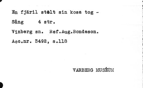 //// t //// 5 //// ^ a //// En fjäril stAlt sin kosa tog - //// * - //// E //// Sång 4 str. ^ //// . .. . //// t //// f //// Vinberg sn. Ref.Aug.Bondeson. ; //// . //// r //// Acc.nr. 3492, s.118 ! //// i //// : //// < //// ! //// j //// { //// VARBERG MUSÉUM //// i //// i ////