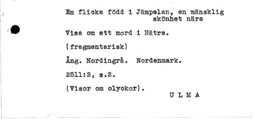 //// En flicka född 1 Jämpelan, en mänsklig //// ! skönhet nära //// ) * Visa om ett mord i Nätra. //// i //// (fragmentarisk) //// Ang. Nordingrå. Nordenmark. //// ^ ... * ^ //// 2511:2, s.2. //// (Visor om olyckor). //// U L M A //// * //// __y \ _____^ _____ //// /