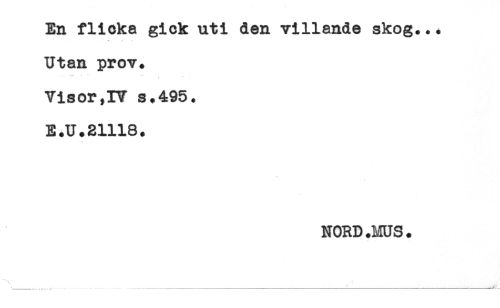 //// En flicka gick uti den villande skog... //// Utan prov. //// < //// Visor,IV s.495. //// E.U.31118. //// NORD.MUS. ////