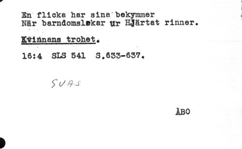 //// En flicka har sina"bekymmer i //// När barndomslekar vr Hjärtat rinner. //// 7 * *' „ //// Kvinnans trohet* //// * ; * - - //// 16:4 SLS 541 S.655-657. //// ÅBO ////