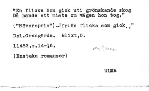 //// "En flicka hon gick uti grönskande skog //// Då hände att miste om vägen hon tog." //// ("Rövarepris") *Jfr:En flicka som gick,." //// Dal* Grangärde. Blixt,0 * //// 11482,s+14-16. //// (Enstaka romanser) //// UIHA ////