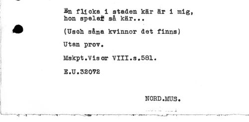 //// t i . * //// i //// En flicka i staden kär är i mig, //// hon spela% så kär... //// i * ' - - //// (Usch s&na kvinnor det finns) //// * //// < //// Utan prov. //// Mskpt.Visor VIII.s.581. //// ; < //// E.U.52072 //// i < //// < //// NORD.MUS. ////