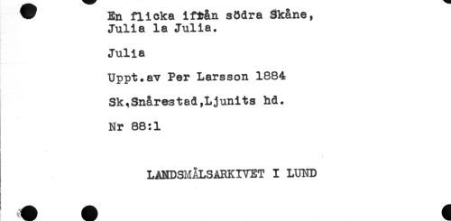 //// w En flicka iftån södra Skåne, //// Julia la Julia. //// Julia //// Uppt.av Per Larsson 1884= //// SksSnårestad,Ljunits hd. //// - //// Nr 88:1 //// LANDSMÅLSARKIVET I LUND //// ! //// t ////