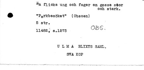 //// ^n flicka ung och fager en gosse s&or //// och stark. //// A* //// ^ "Parkbesöket" (Obscen) //// 5 str. //// 11482, s.1273 //// * //// U L M A BLIXTS SA^.^L. //// SVA KOP //// -- --rt^^----f ----Y---t-----:---- ----^r- ////