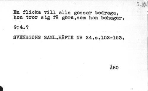 //// En flicka vill alla gossar bedraga, //// hon tror sig få göra,som hon behagar. //// 9:4.? //// ; * - * //// -- //// SVENSSONS SAML.HÄFTE NR 24.s.152-153. //// ' ? i //// ÅBO //// t //// * //// i //// < //// { //// B //// ä ! ////