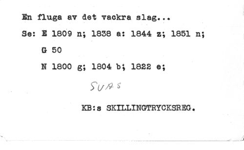 //// En fluga av det vackra slag... //// - * j < //// ' * 4 . . //// Se: E 1609 n; 1838 a: 1844 z; 1851 n; //// & 50 //// N 1800 g; 1804 b; 1822 e; //// KB:s SKILLINGTRYCKSREG. //// \...... -- .......^ ////