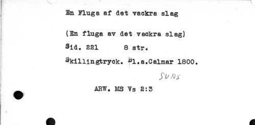 //// En Fluga af det vackra slag //// t //// ! //// (En fluga av det vackra slag) //// ** //// Sid. 221 8 str* //// . //// Skillingtryck. ^l.a.Calmar 1800. //// j - //// ? * //// B \ //// ^ ARW. US Vs 2:3 ////