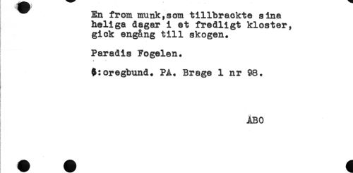 //// * En from munk,som tillbrackte sina //// heliga dagar i et fredligt kloster, //// gick engång till skogen. //// Paradis Fogelen. //// $:oregbund. PA. Brage 1 nr 98. //// t //// t //// i //// ÄBO //// p //// t < //// ! ////