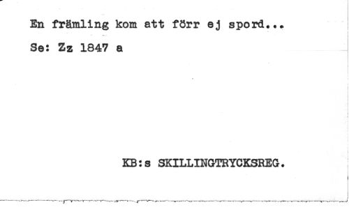 //// ] //// En främling kom att förr ej spord... //// ** < //// Se: Zz 1847 a //// ! //// * ! //// t //// i //// t //// . < //// t //// < //// KB:s SKILLINGTRYCKSREG. ////