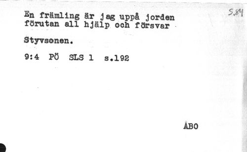 //// En främling är jag uppå jorden //// förutan all hjälp och försvar //// Styvsonen. //// 9:4 P8 SLS 1 s.192 //// ÅBO ////