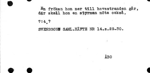 //// En fröken hon ner till havsstranden går, //// där skaH hon en styrman möta också, //// t. //// 7:4,? //// SVENSSONS SAML.HÄFTE NR 14.s.29-30. //// ÅBO ////