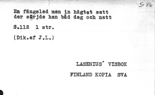 //// En fängslad man in hägtat satt //// der sörjde han båd dag och natt //// S.112 1 str. //// (Dik.af J.L.) //// t //// ) //// : //// f //// ] //// LASENIUS' VISBOK //// FINLAND KOPIA SVA //// ) //// ! //// f //// ^ //// ! //// ä [ ////