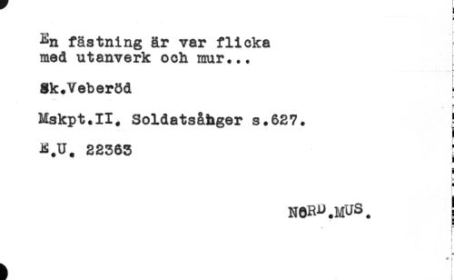 //// ^ i //// < //// i //// ^n fästning är var flicka //// med utanverk och mur... //// Sk.Veberöd * //// = //// - ? //// Mskpt.II. Soldatsåhger s.627. ! //// ! //// E^u. 22363 j //// i //// H //// NOR^.MUS. I //// < //// < //// i ////