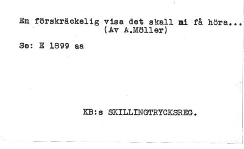 //// En förskräokelig visa det skall mi få höra... //// (Av A.Möller) //// Se: E 1899 aa //// * //// f //// KB:s SKILLINGTRYCKSREG. ////