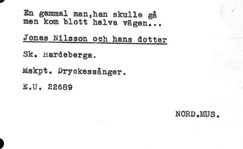 //// En gammal man,han skulle gå //// men kom blott halva vägen... //// Jonas Nilsson och hans dotter //// Sk. Rardeberga. //// Mskpt. Dryckessånger. //// E.U. 22689 //// NORD.MUS. ////